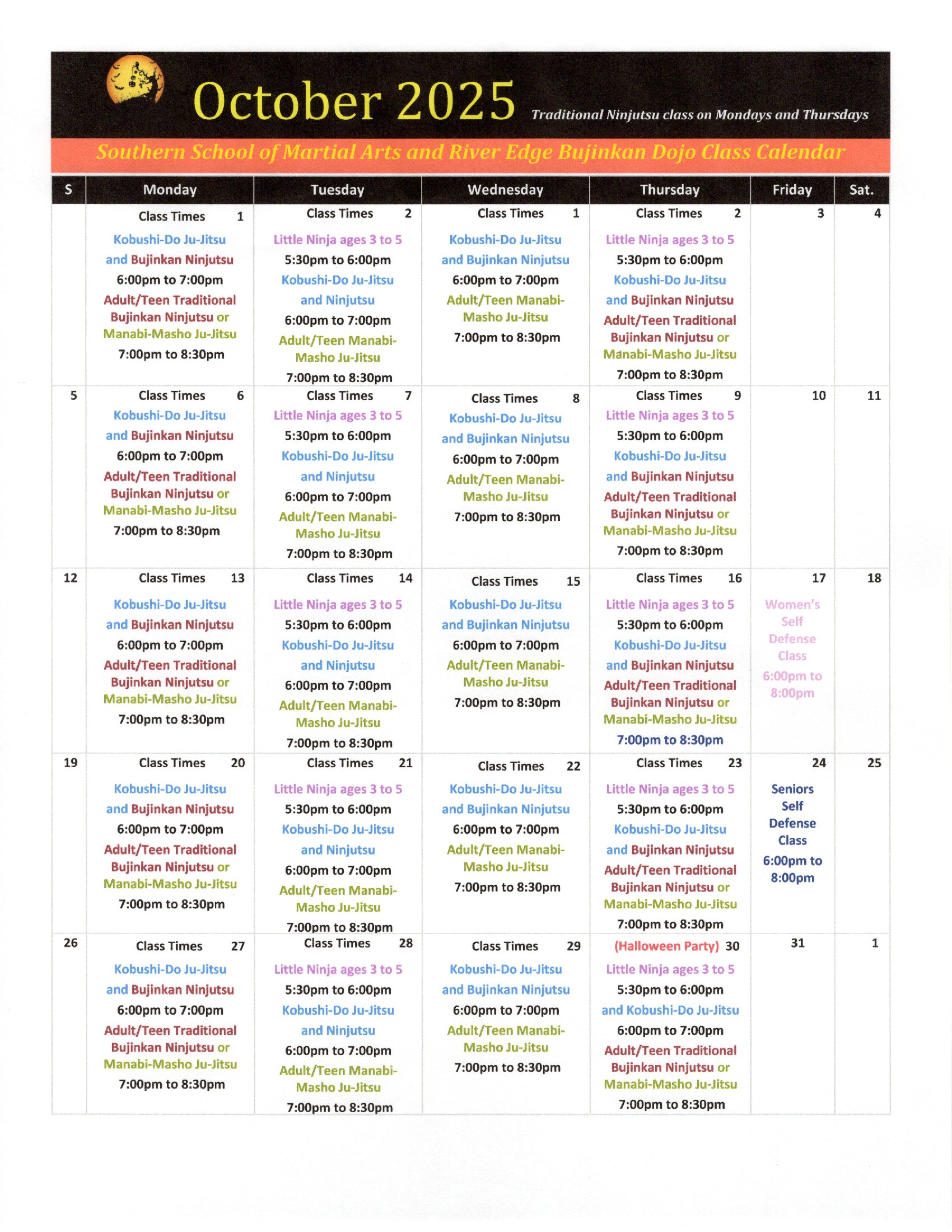 Little Ninja Class, Tuesdays and Thursdays Pre-school Children’s Ju-Jitsu and Children’s Ninjutsu:  5:30pm to 6:00pm.