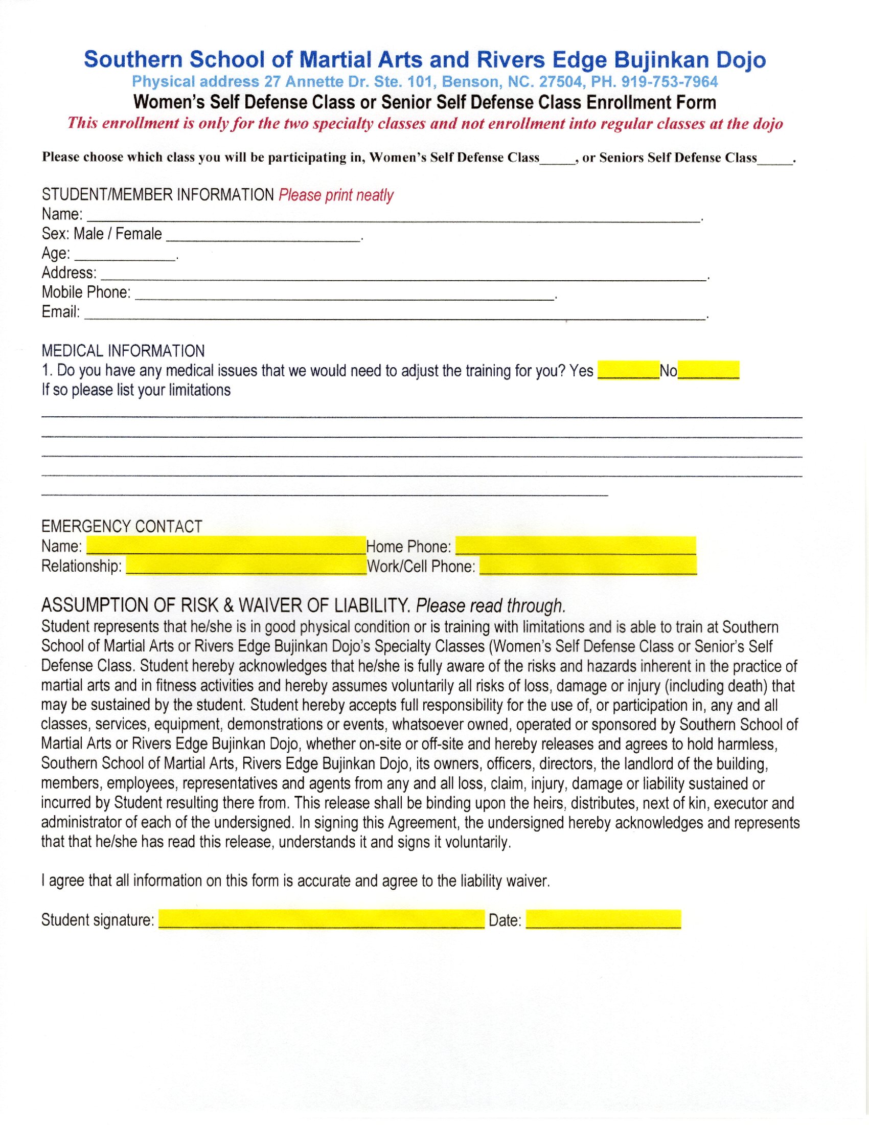 Women's Self Defense Class, or Senior's Self Defense Class Enrollment Form